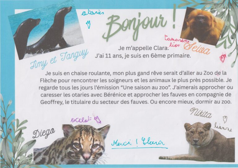 Mon plus grand rêve serait d’aller au Zoo de la Flèche pour pouvoir rencontrer les soigneurs et les animaux le plus près possible. Je regarde tous les jours l’émission « Une saison au zoo ». J’aimerais approcher ou caresser les otaries avec Bérénice et approcher les fauves en compagnie de Geoffrey, le titulaire des fauves ou encore mieux… dormir au zoo !